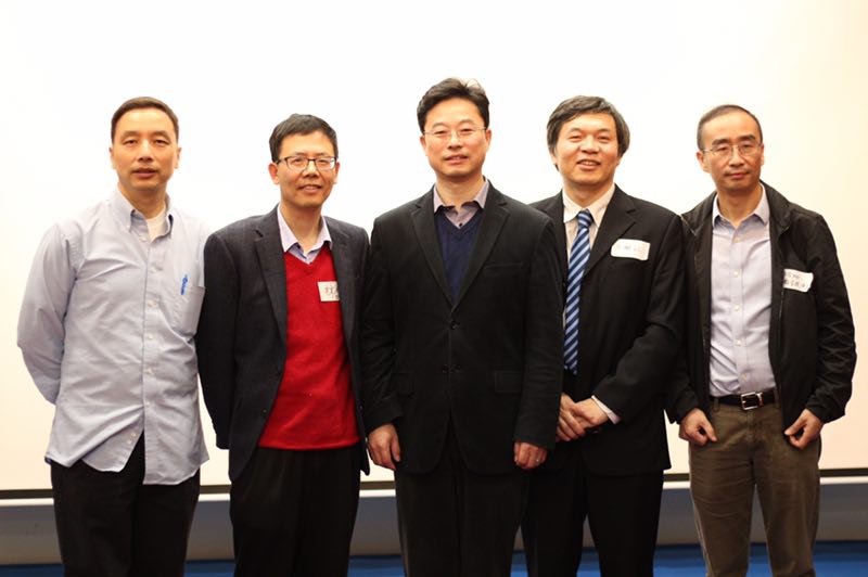 中领馆驻旧金山教育参赞杨军(中)与华工校友会会长林仕,湘大校友会会长马湘江,中大校友会会长朱会灿,以及华工校友会副会长,节目主持陈赛因的合影