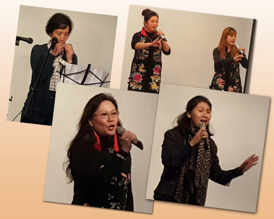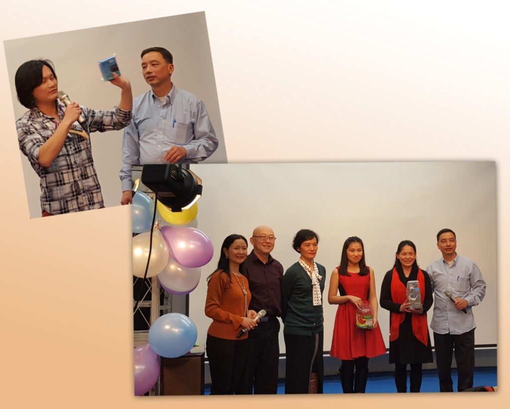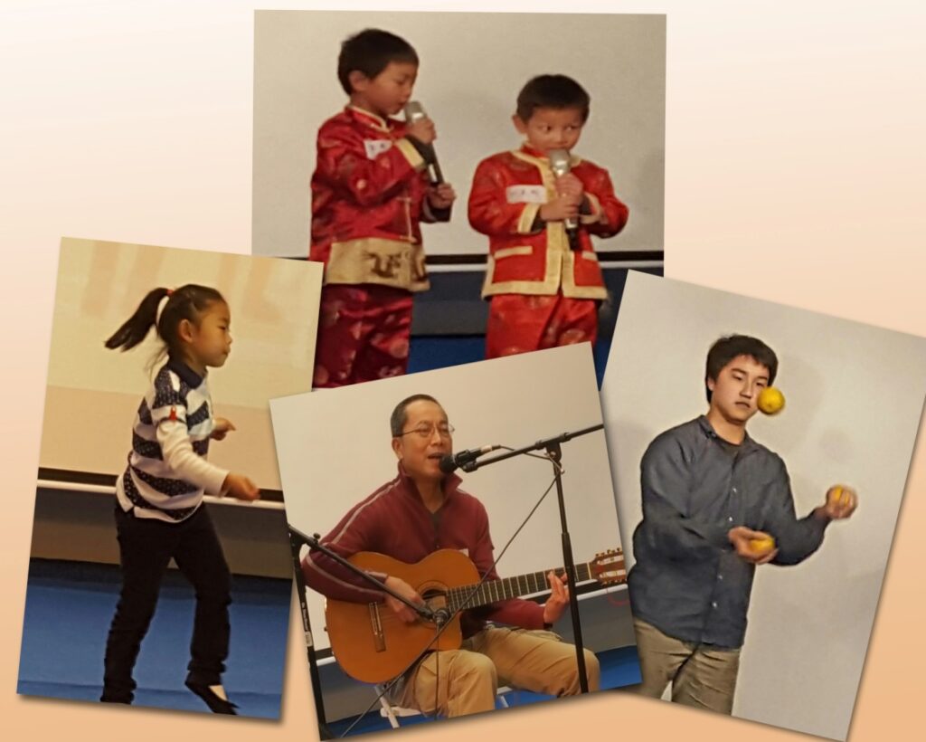 团年饭过后,就进入了精彩纷纭的一轮接着一轮的才艺表演和礼物抽奖环节。小小的舞台上,深情的歌声,饱蘸春天的色彩:婀娜的腰身,优雅地舞动春风;纤巧的指尖,流淌出春天的溪流……在这个轻歌曼舞的舞台上,我们华工校友会出的节目也毫不逊色。朱跃生理事儿子Dennis的电吉它弹奏,以其强烈的穿透力震撼全场;石益坚理事的男高音独唱抒情婉转;陈赛因副会长五岁小女儿Melody热情欢快的舞蹈“小苹果”趣稚盎然;刘斌理事的两位小朋友,身穿鲜红的小唐装,用天籁的童音,为观众献上了一曲“祝福你”;由石益坚,陈赛因和Dennis三人组合的吉它弹唱“财神到”,更是把晚会的气氛推向一个高潮,这首带着浓郁南粤年味的粤语贺年歌曲,引来在场观众的共鸣和声声的和唱。