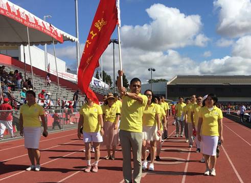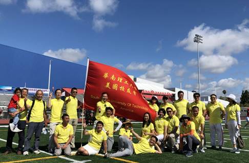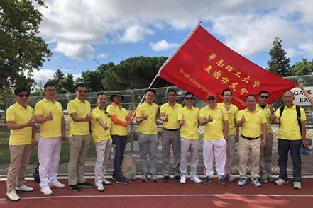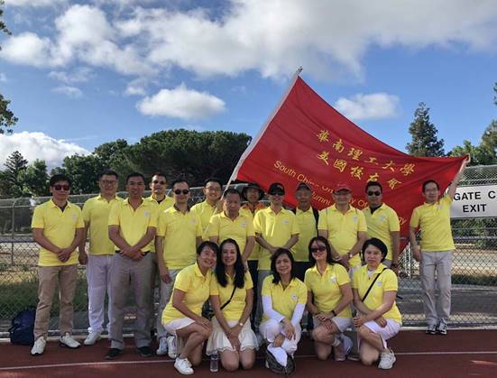 华南理工大学美国校友会(硅谷)的校友们,在窦晓红,肖恒两位理事的热心组织下,组队参加了开幕入场仪式。校友会的林仕会长和部分副会长,理事,上至八十高龄的老校友,下至毕业不久的90后,组成了一支华体会里最引人瞩目的队伍。有趣的是,运动场上校友会那面鲜红醒目的会旗,引来了几位“慕旗而来”的校友,对于那几位之前没有联系上校友会的校友,他们这回以旗为缘找到了组织,而对于我们的队伍,也因他们的现场加入而更壮大。